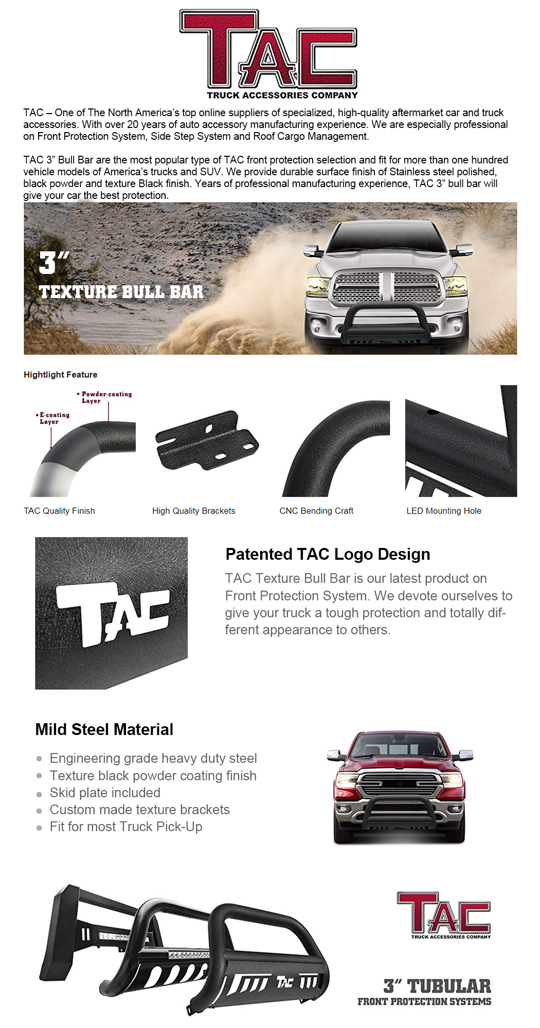 OUTSTANDING DESIGN - TAC bull bar creates a tough, heavy-duty appearance on the front end of your car while also providing protection and visibility.